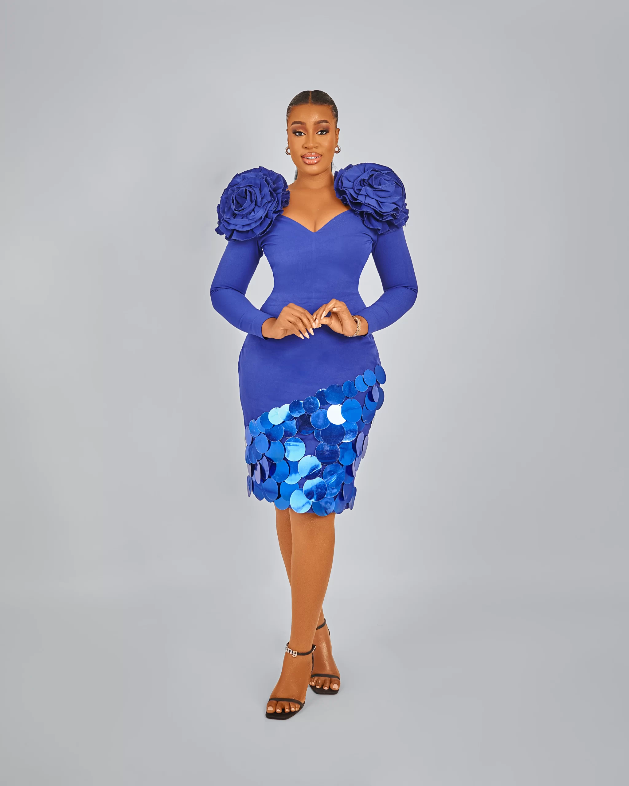 Designed for the woman who loves to captivate and intrigue. This elegant midi dress features shimmering sequins on the bottom half, bold flower-like ruffles on each shoulder, and a sophisticated Queen Anne neckline. Perfect for any special occasion, the Enigma Dress promises to captivate and enchant.