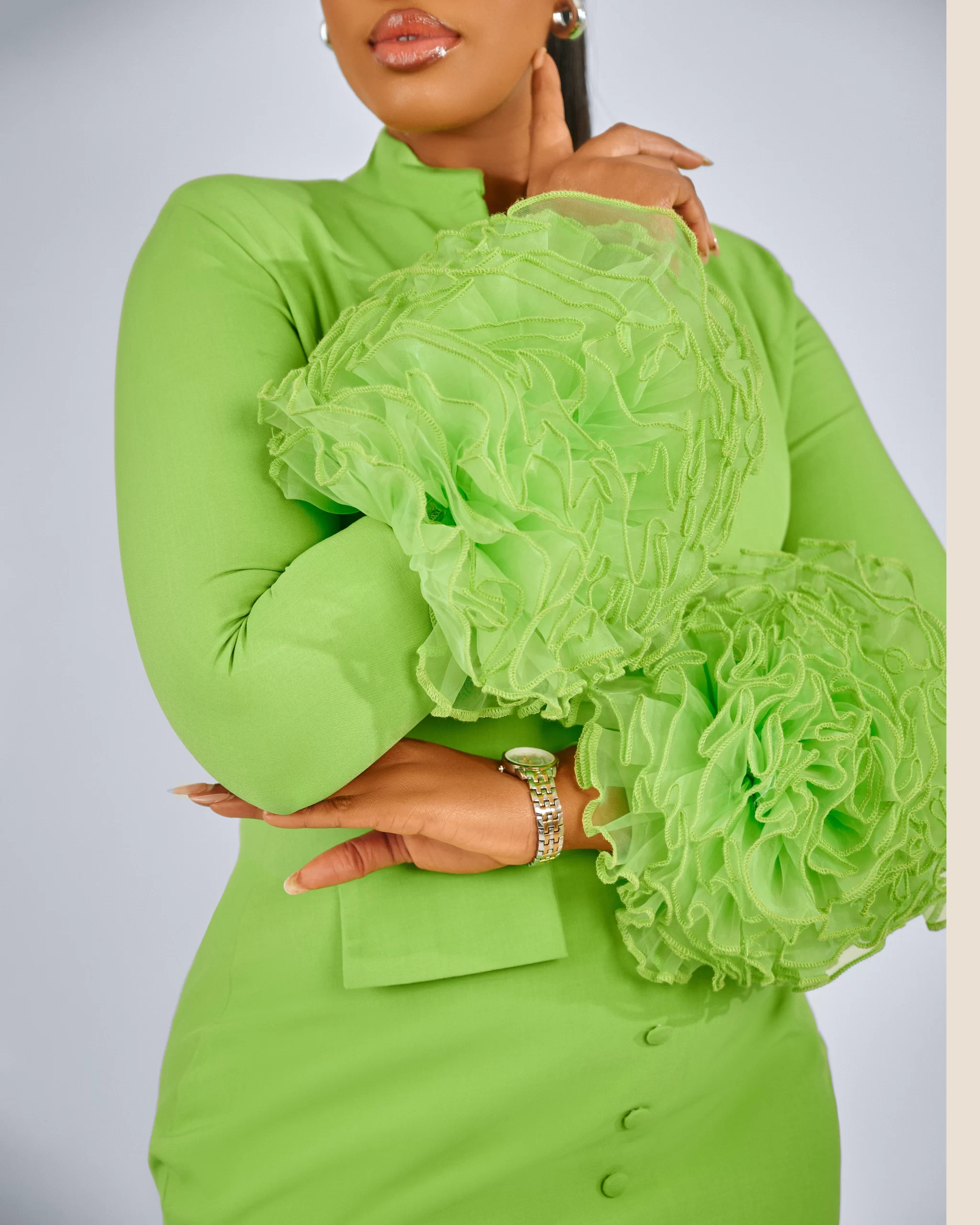 The “Eve” midi dress is an elegant and sophisticated piece crafted from luxurious crepe material, available in vibrant apple green, striking red, and classic black. It features a classic bishop collar adorned with delicate organza ruffles at the wrists, adding a touch of whimsical charm. Buttons running down the front forming a straight line, and the dress opens with a zipper at the back for easy wear. This timeless design, combined with its refined color options, makes it a perfect choice for any stylish occasion.
